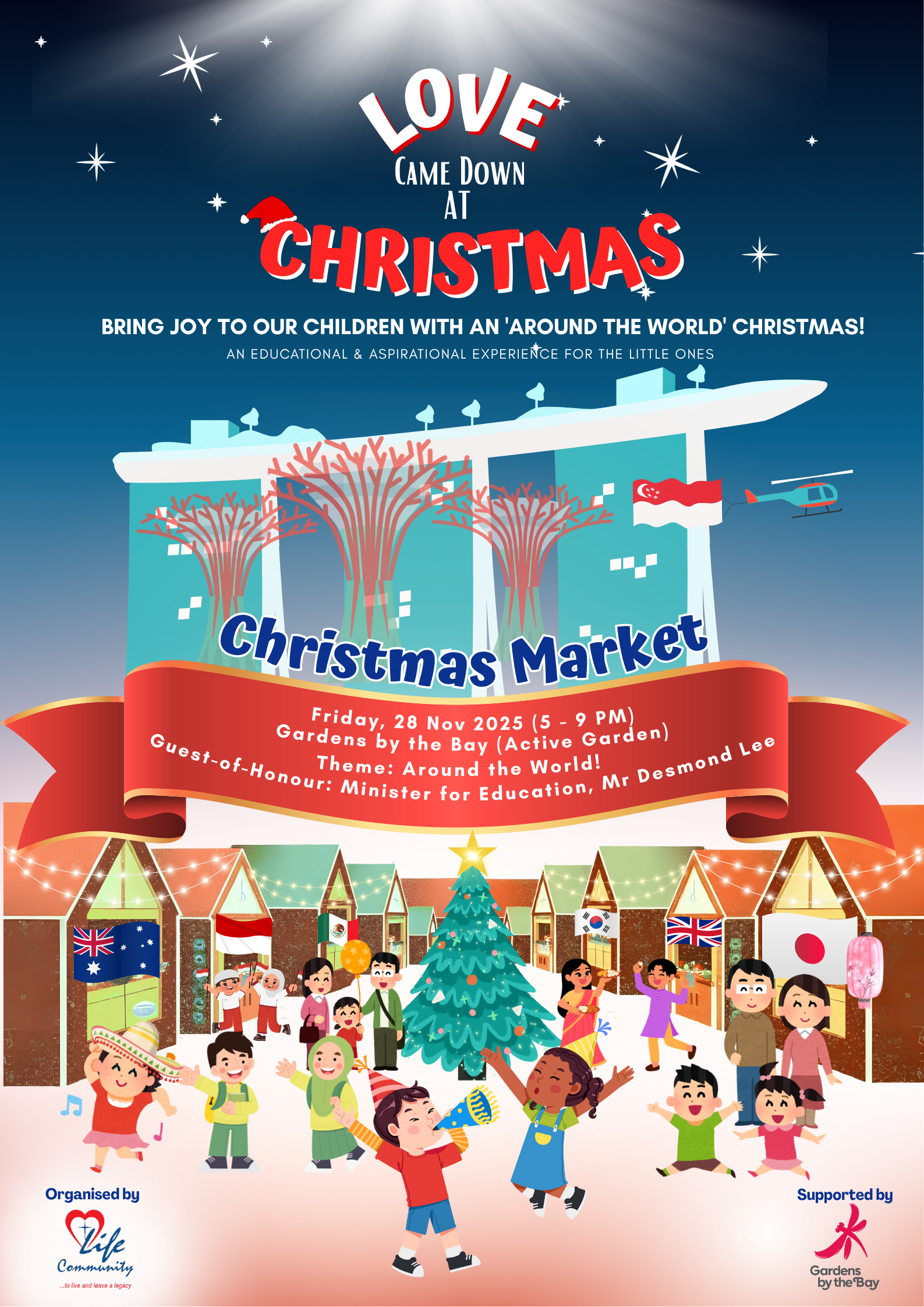 This year, we are bringing joy to our children with an “Around the World” Christmas on 28 November 2025, Friday, 5.00 – 9.00 pm at Gardens By The Bay (Active Garden)!